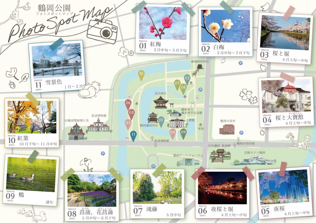 今回は、鶴岡市が作成した「鶴岡公園の四季の自然を楽しめるフォトスポット」をまとめたフォトスポットマップをご紹介いたします。ぜひ、カメラと共に鶴岡公園を散策してみてはいかがでしょうか。