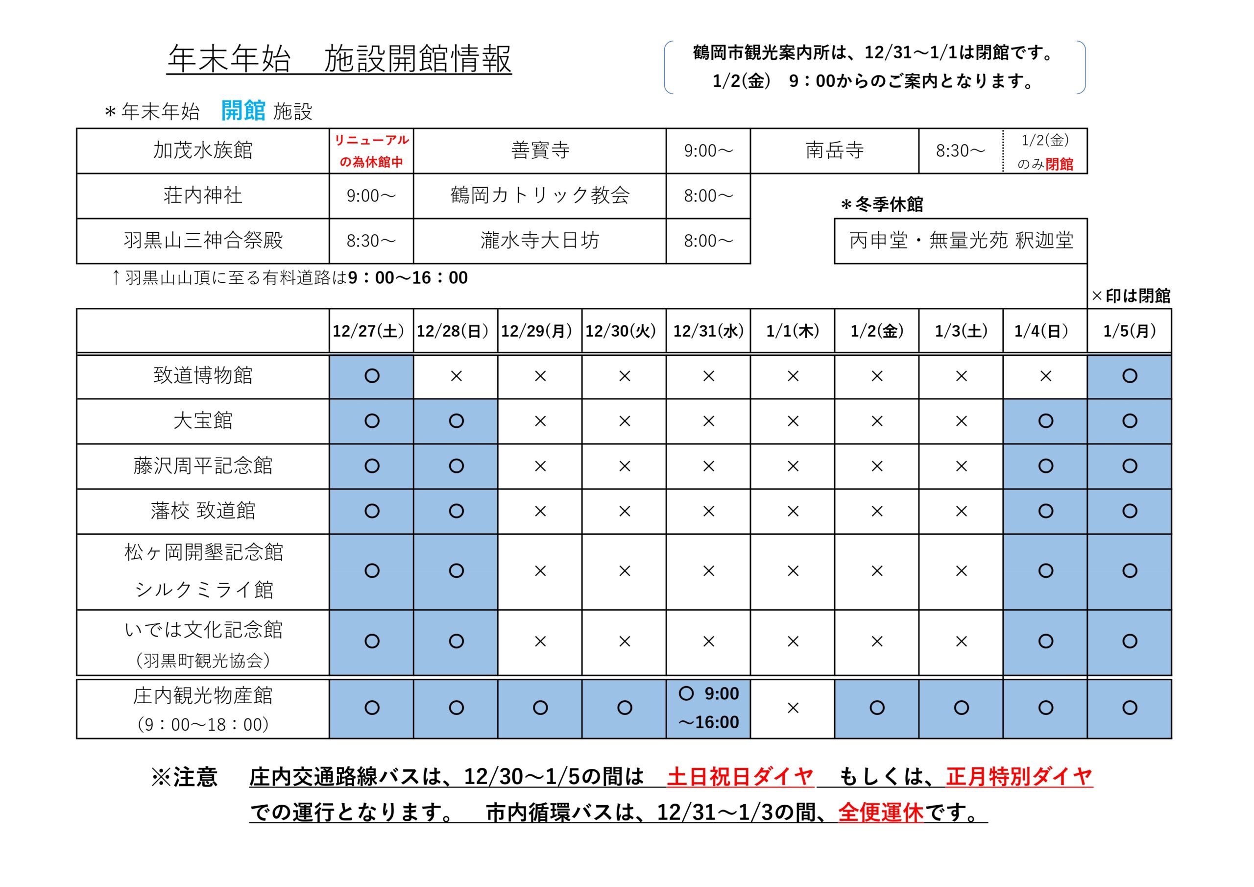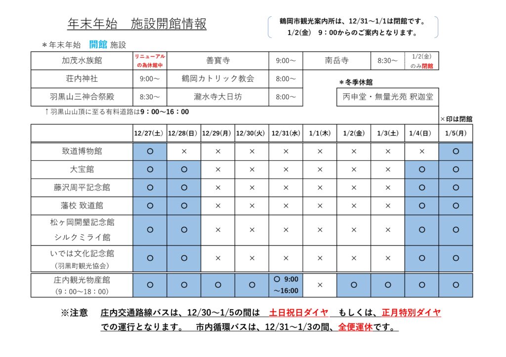 鶴岡市観光案内所休業日 及び 市内観光施設の年末年始休館日について