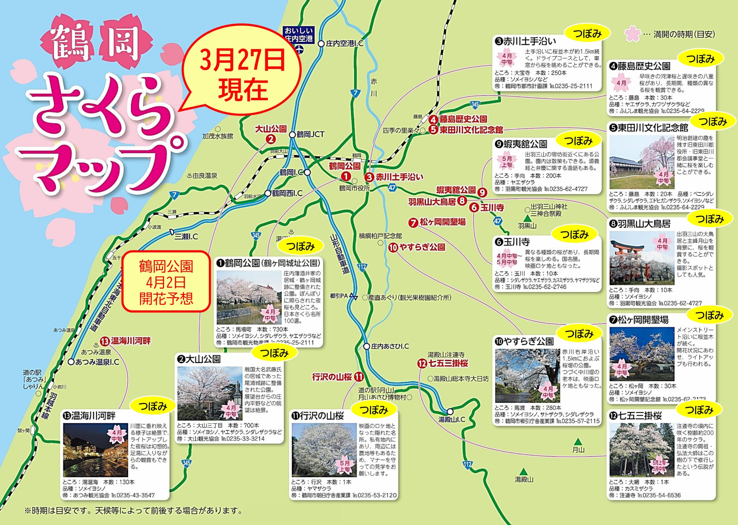 【2026】桜の開花情報【3/27時点】 2026年3月27日 NEW 山形県鶴岡市内の桜スポット情報を2026年もお届けしてまいります🌸鶴岡公園の2026年開花予想は【4月2日】🌸 ≫ 春のイベント情報についてはこちら 鶴岡の桜スポット情報は、以下の特集等もご覧ください。 ●【鶴岡桜めぐり】市内桜スポットMAP●【鶴岡桜めぐり】市内桜スポット紹介●春の桜を山形で 山形鶴岡の桜スポット!