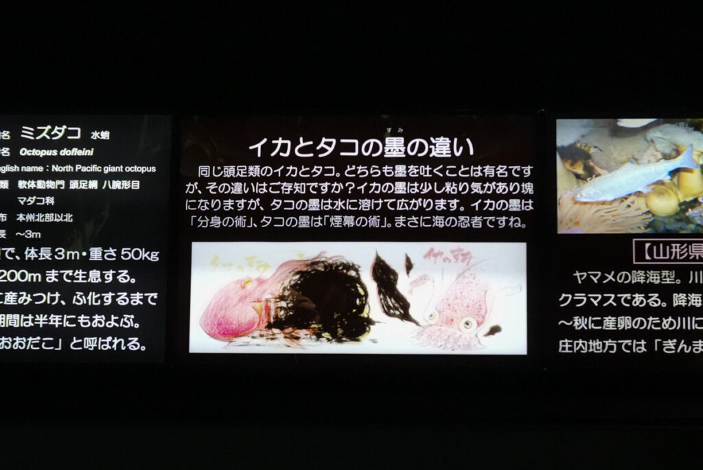 加茂水族館には、地域の食文化と結びついた展示も数多くあります。わかりやすい図解で紹介される地域の漁業、海と川のサケの塩引きの違い、タラの部位ごとの料理法など、地域の暮らしに根ざした食を学ぶことができます。