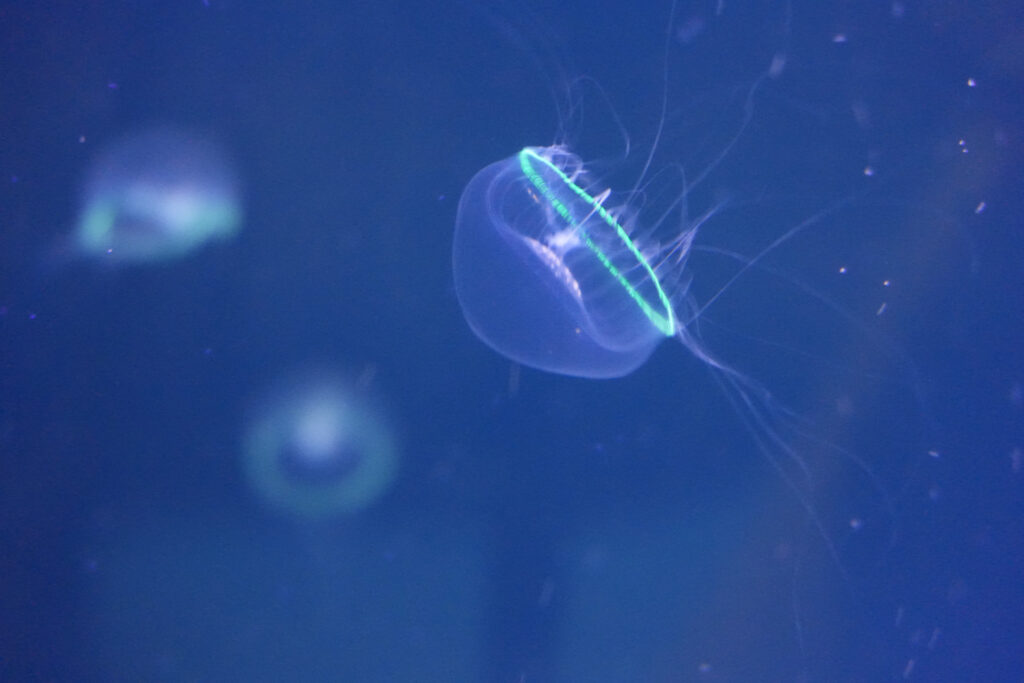 例外は、発光を観察できるオワンクラゲ。ここでは紫外線ライトを使い、クラゲが持つ不思議な光を体験できる特別な展示となっています。