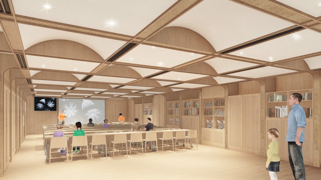 新しくできた建物は3階建ての「研究棟」になります。1階は大きなレクチャールームです。これまで1クラス程度しか受け入れられなかった学習会が、3クラス同時に実施できるようになります。講演会や特別展も開催でき、小さな図書コーナーも備えます。子ども向けの生き物の本も置いて、誰でも気軽に利用できる“学びの場”にしたんです。