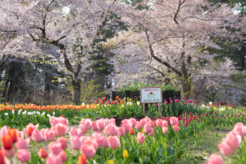 | スポット情報 | 市民団体「庄内チューリップ倶楽部」によって整備されているチューリップ園。チューリップが咲き始める4月下旬には、園内の桜も見頃を迎え、春の花々が彩る絶景が広がります。桜のあとも多彩なチューリップが咲き誇り、春ならではの華やかな風景を楽しめます。 |