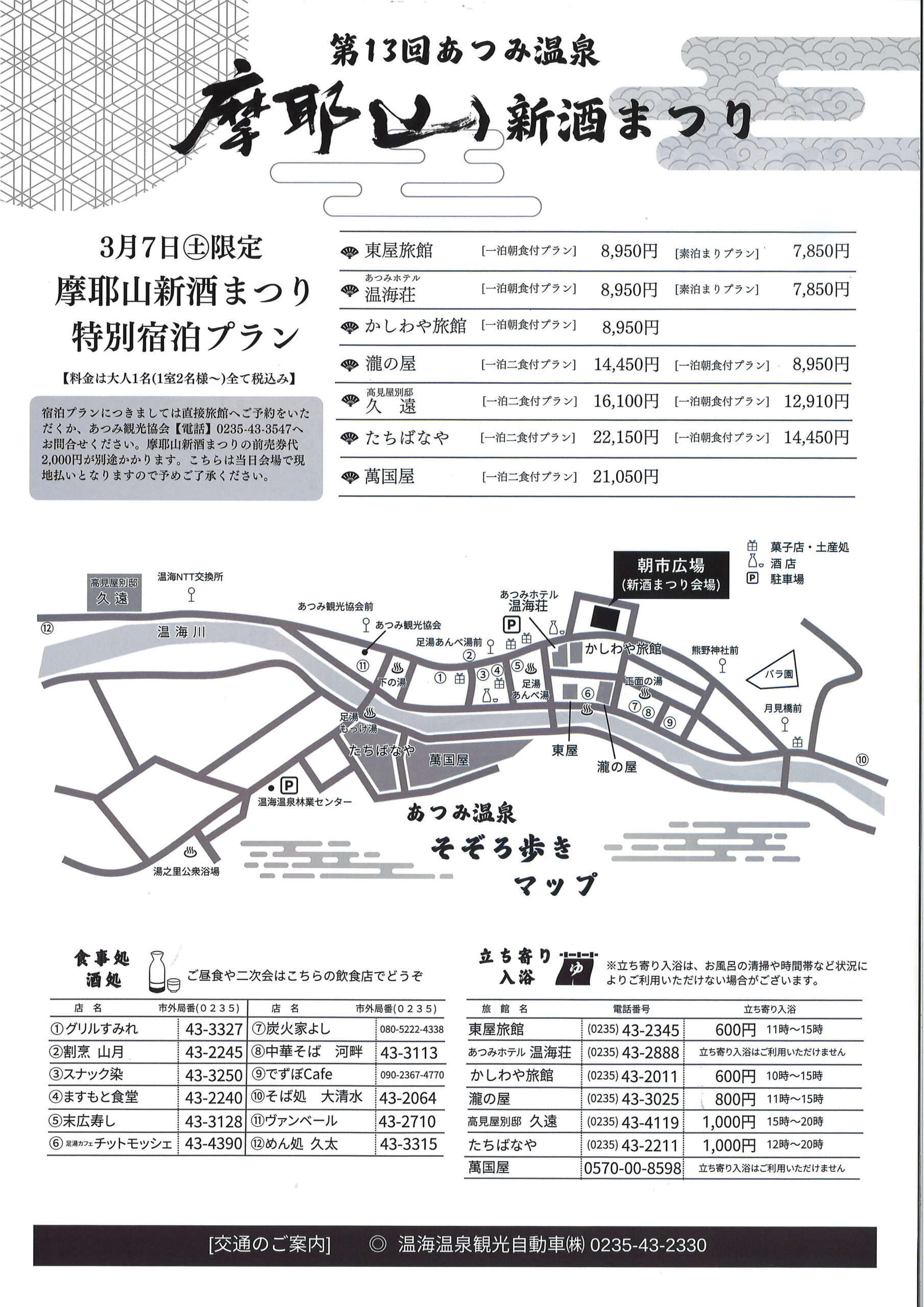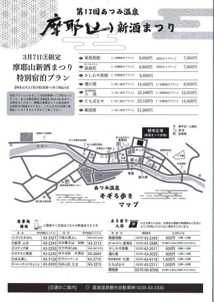 | 限定特別宿泊プラン | ★あつみ温泉の各旅館では、3/7(土)「摩耶山新酒まつり」限定特別宿泊プランを実施。 立ち寄り湯は、旅館により実施状況が変わります。あつみ観光協会公式サイトをご参照ください。 |