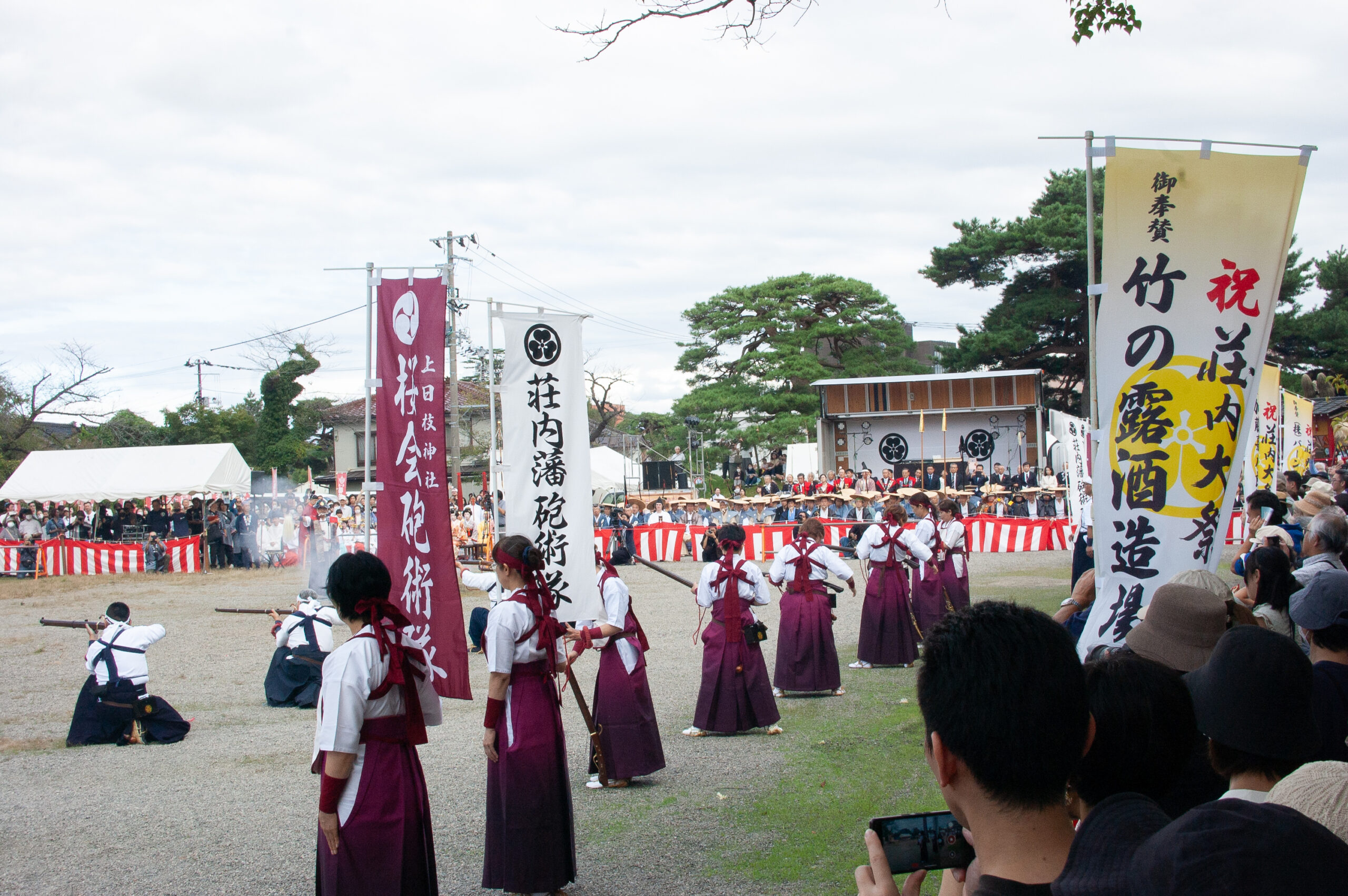 荘内神社が創建された明治10年に、旧藩主を慕う市民の手でかつての大名行列が再現され、天下人秀吉より賜った金びょうたん槍を先頭に、奴振り、鎧武者の甲冑列など総勢約400名からなる「荘内藩伝承大名行列」が、城下町・鶴岡に歴史絵巻を繰り広げます。