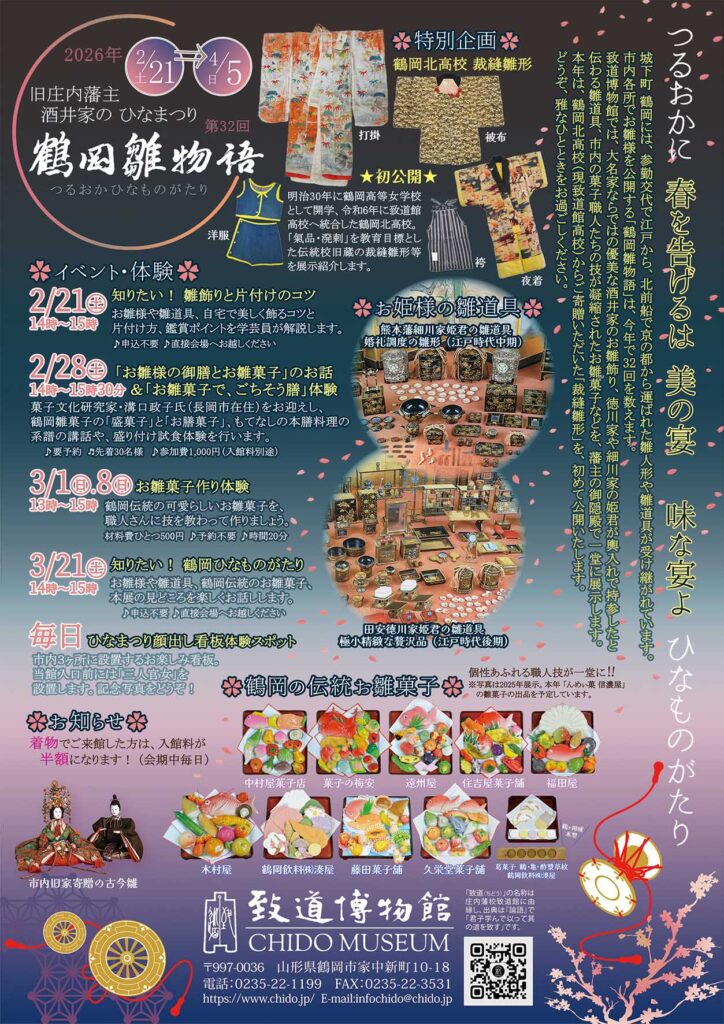 | 「お雛様の御膳とお雛菓子」のお話&「お雛菓子で、ごちそう膳」体験 | 菓子文化研究科・溝口政子氏をお迎えし鶴岡雛菓子やもてなしの本膳料理の系譜の講和や、盛り付け試食体験 開催日:2026年2月28日(土)14:00~15:30 定員:先着30名 参加費:1,000円(入館料別途) ※要予約 |